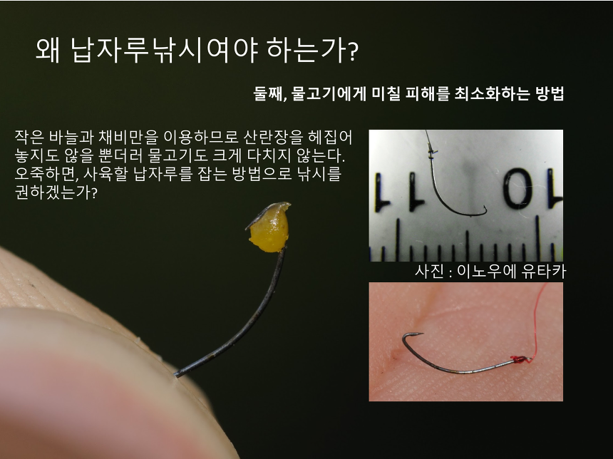 뿐만 아니라 저는 바늘 낚시가 초래하는 고통을 최소화하기 위해 나름의 노력을 합니다. 일단 연구대상종(납자루과의 물고기)이 손가락 몇 마디 정도로 작으므로 물고기 입에 박히는 바늘 길이는 1mm 정도로 작은 것을 사용합니다 (사진 참조). 손가락에 찔려도 각질에 걸려서 사람에게도 치명적이지 않은 수준입니다. 그마저도 상처를 최소화하기 위해서 갈고리처럼 생긴 미늘이 제거된 바늘을 씁니다 (사진 참조). 저는 이 방법으로 낚인 물고기를 어항에서 길렀을 때 단 한 마리도 바늘의 상처로 인해 죽는 경우를 보질 못했습니다. 트라우마도 없어서 다음날부터 사료를 받아먹는 행동을 보여주었으며, 오랜 기간 동안 문제없이 길렀습니다.
